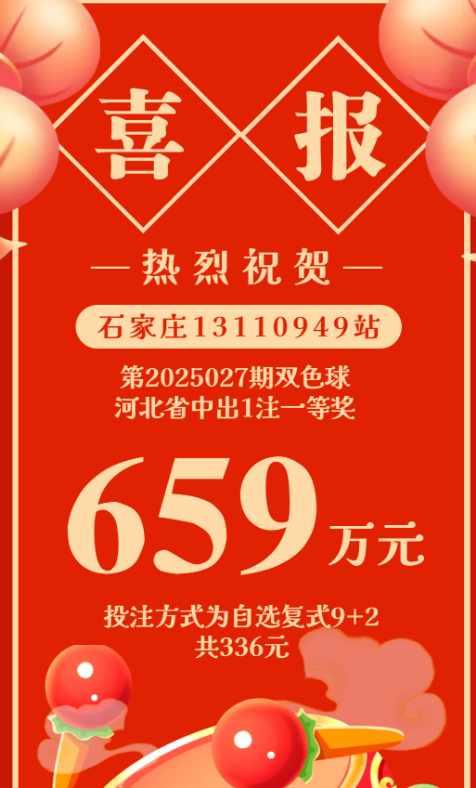 春光明媚的时节,石家庄传来双色球头奖的喜讯。3月13日晚,双色球第2025027期开奖,全国共中出13注一等奖,其中一注来自石家庄。幸运大奖来自位于雅清街和东岗路口东南角的13110949彩站,该站的中奖方式为自选复式9+2投注,投注金额336元,奖金高达659万元。