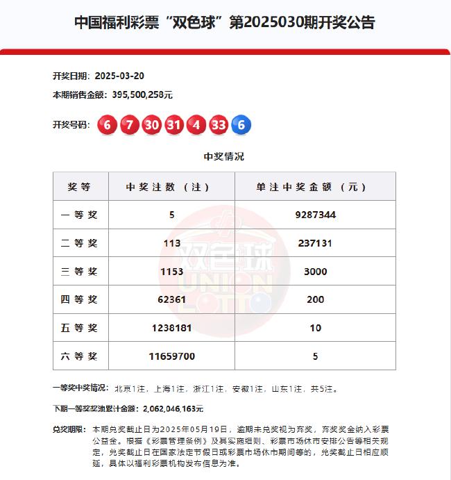 - 21:18:所有奖号产生,红球为04、06、07、30、31、33,蓝球为06。