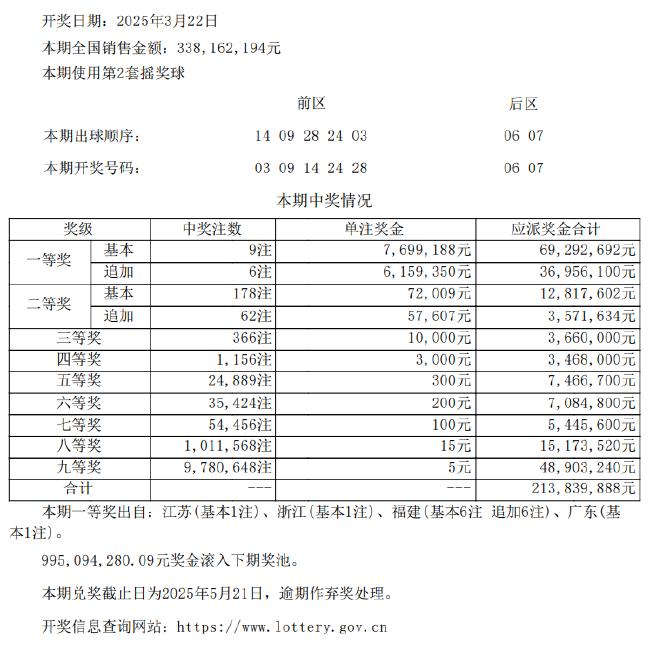 本期全国销量为3.38亿元,奖池方面,9.95亿余元滚存至3月24日(周一)开奖的第25031期。