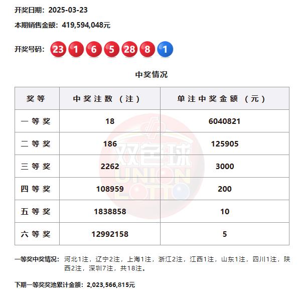 北京时间2025年3月23日,福彩双色球第25031期开奖,以下是详细开奖流程: