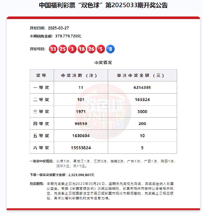 22:09 本期一等奖开出11注,单注奖金621万余元,分落江苏(3注)、湖南(2注)、北京、黑龙江、广东、广西、陕西和深圳。二等奖开101注,单注奖金16.5万余元。本期双色球全国销量为3.79亿,计奖结束后奖池余额为20.23亿余元。