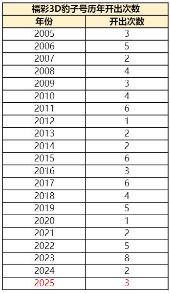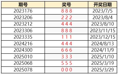 福彩3D曾在2024年仅开出过2次豹子号,而如今时隔10天开出豹子号,也是进入2025年以来开出的第3次豹子号,这也是自2024年以来,第3次出现偶码豹子号,近10次3D豹子号组合里,全偶数组合开出7次。