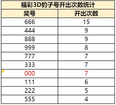从上表我们可以看到,福彩3D自开售以来已经开出了77次豹子号,其中开出最多的是豹子“666”多达15次,“444”和“888”开出次数均为9次,并列第二。本次福彩3D开出“000”的豹子号后,累计开出7次。