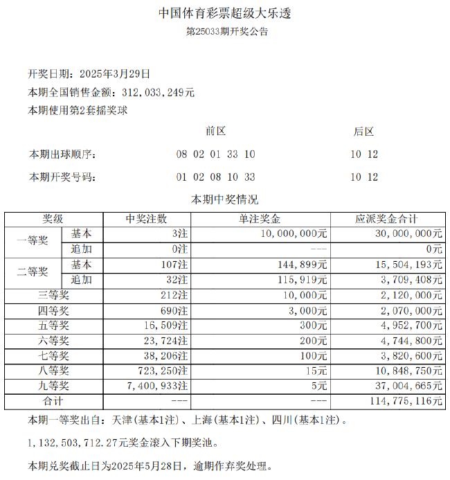 北京时间3月29日晚,体彩大乐透第25033期开奖,当期开奖号码为前区01 02 08 10 33,后区10 12。