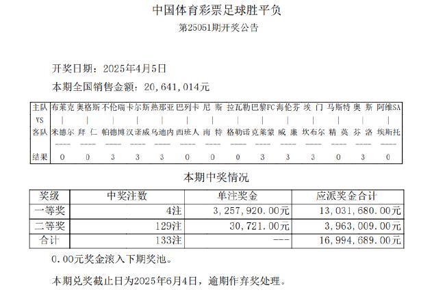 南特2-1客胜尼斯北京时间4月6日,胜负彩第25051期开奖结果揭晓。本期头奖开出4注,单注奖金3,257,920元,二等奖开出129注30,721元,任九开出751注16,983元。本期足彩销量为20,641,014元,任九投注总额为19,929,082元。