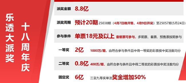 为庆祝大乐透上市18周年,国家体彩中心于近日发布《关于开展2025年超级大乐透派奖活动的公告》,将于第25038期(4月9日开奖)开始派奖,预计持续20期,派奖总额8.8亿元。本次派奖活动与往年派奖略有不同,仅针对单票18元及以上的投注,其中套餐票也可参与其中、多期票、套票、预售票按期参与。