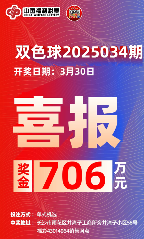 3月30日晚,中国福利彩票双色球游戏第2025034期开奖,开奖结果揭晓,红球号码为26、24、13、08、14、5,蓝球号码为12。当期全国共中出8注一等奖,每注奖金为706万元。令人振奋的是,这其中有1注大奖落在了湖南省长沙市雨花区井湾子小区58号43014064福彩投注站。这张中奖彩票是一张10元单式机选票,幸运彩民凭此票斩获了706万元的双色球一等奖。