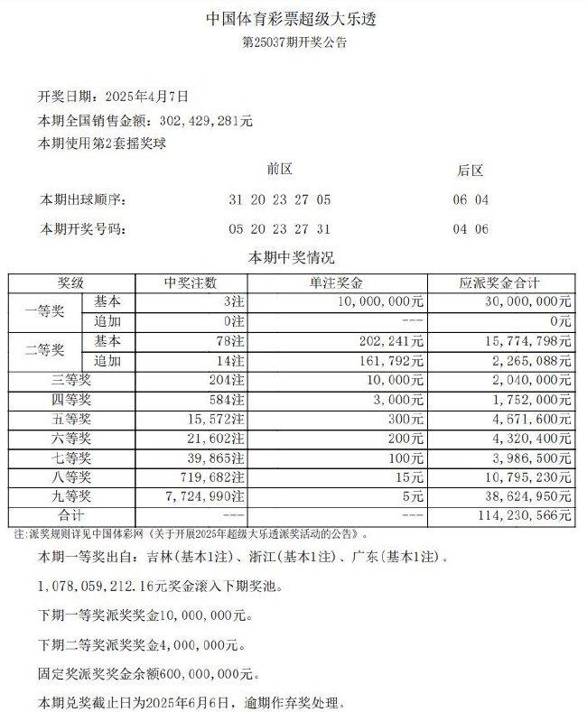 本期全国销量为3.02亿元,奖池方面,10.78亿余元滚存至4月9日(周三)开奖的第25038期。