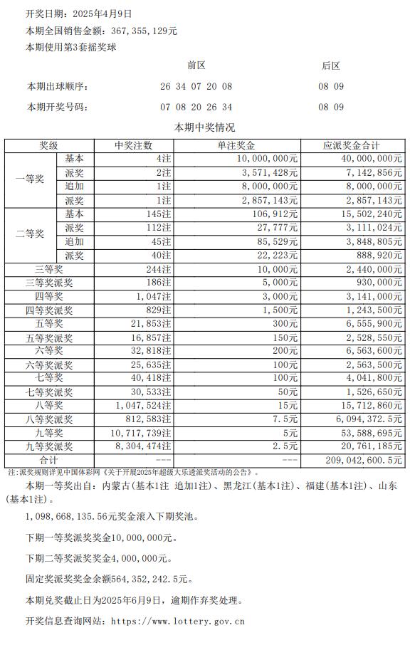二等奖开出145注,单注奖金10.6万余元,其中112注获得基本二等奖派奖,每注多得2.7万余元;145注二等奖中有45注选择追加,多得奖金8.5万余元,其中还有40注获得追加派奖奖金2.2万余元。本期全国销量为3.67亿元,奖池方面,本期开奖结束后,10.98亿元滚存至4月12日(周六)开奖的第25039期。