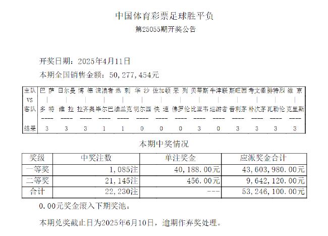 热刺1-1法兰克福北京时间4月11日,胜负彩第25055期开奖结果揭晓。本期头奖开出1085注,单注奖金40,188元,2107万滚存被清空。二等奖开出21145注456元,任九开出74166注174元。本期足彩销量为50,277,454元,任九投注总额为20,169,130元。