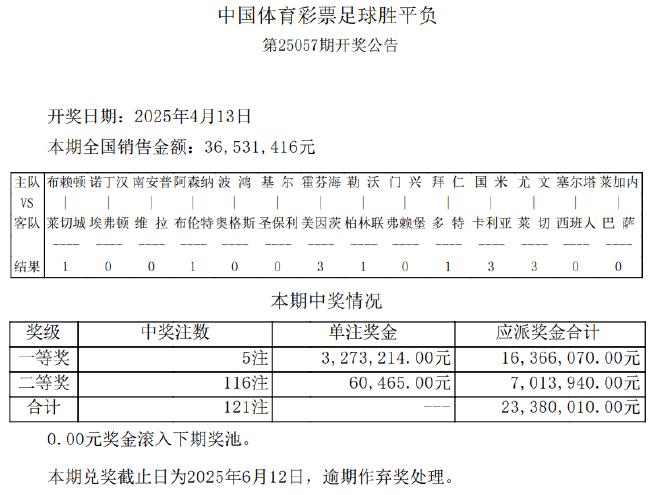 拜仁2-2多特北京时间4月13日,胜负彩第25057期开奖结果揭晓。本期足彩头奖开出5注,单注奖金3,273,214元;二等奖开出116注60,465元;任九开1391注10,999元。本期胜负彩销量为36,531,416元,任九投注总额为23,907,260元。