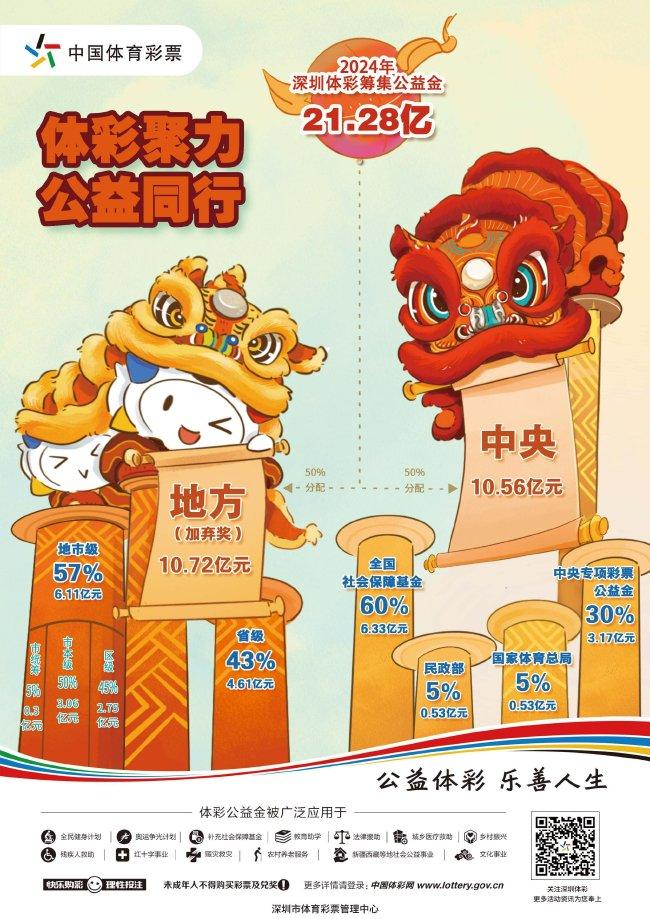 自1994年中国体育彩票全国统一发行销售以来,截至2024年底,深圳体彩已累计筹集公益金193.82亿元。体彩公益金广泛用于补充社会保障基金、红十字事业、教育助学、城乡医疗救助、赈灾救灾、乡村振兴和全民健身、竞技体育等社会公益事业。公益金分配根据相关规定统计,具体分配与使用以各级部门发布的年度公益金使用公告为准。