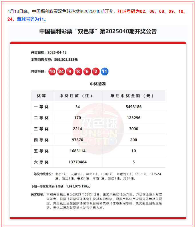 本期双色球全国共开出34注一等奖,江苏24注,北京、天津、河北、山西、内蒙古、辽宁、浙江、安徽、河南和新疆各1注,单注奖金5493186元。本期销量3.99亿元,筹集公益金1.43亿元。
