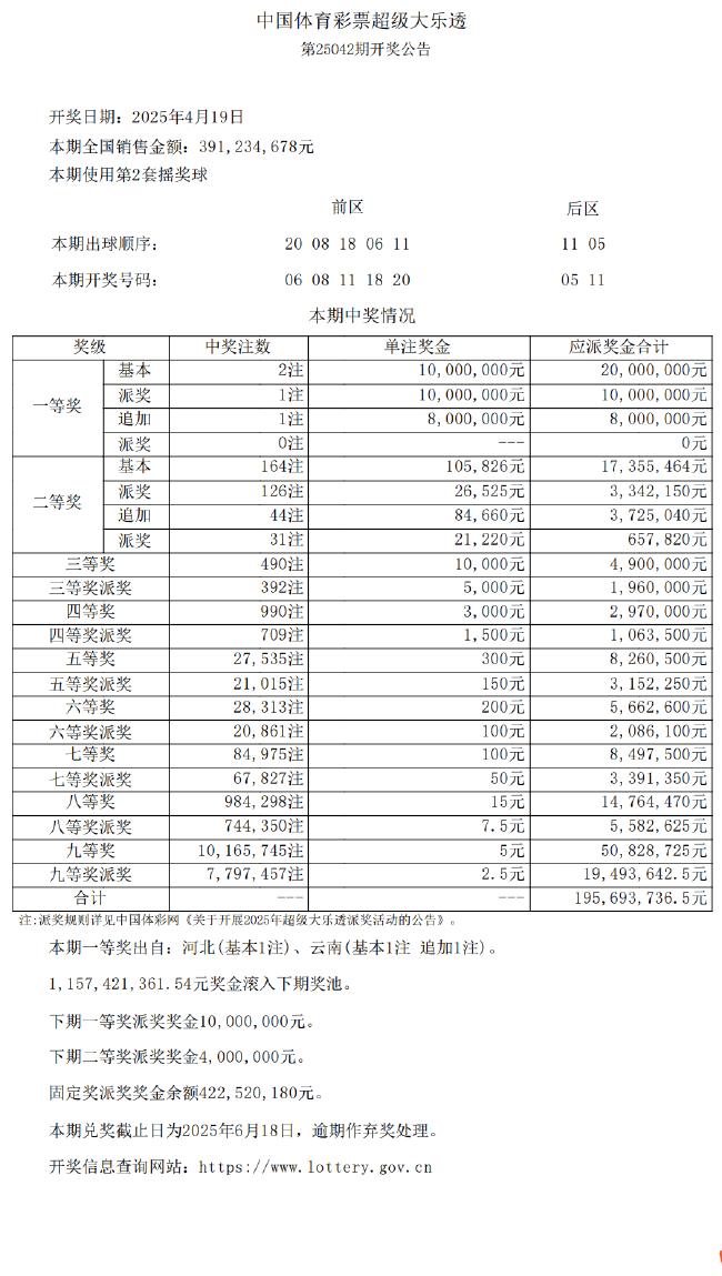 二等奖开出164注,单注奖金10.5万余元,其中126注获得基本二等奖派奖,每注多得2.6万余元;164注二等奖中有44注选择追加,多得奖金8.4万余元,其中还有31注获得追加派奖奖金2.1万余元。本期全国销量为3.91亿元,奖池方面,本期开奖结束后,11.57亿元滚存至4月21日(周一)开奖的第25043期。