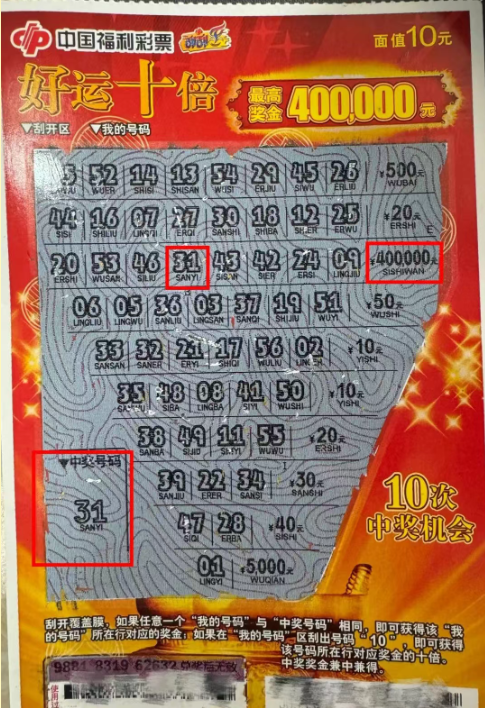 4月9日下午,位于肥东县龙脊山路80号的福彩34012047号销售网点传来了喜讯。一对幸运夫妻刮中即开票“好运十倍”头奖,收获了40万元大奖。据网点销售员回忆,中奖者是该网点的常客,购彩方式一直比较理性,每次投注金额多为10至20元,涵盖了多种福彩玩法。当天下午,这对夫妻只花了10元购买了一张“好运十倍”即开票,意外地在“中奖号码”区域和“我的号码”中发现了相同的号码31,成功中得40万元大奖。销售员感叹道:“他平时投注金额都很小,这次只买了一张票就中了头奖,真是运气来了挡不住。”中奖后,夫妻二人激动不已,立即驱车前往福彩中心办理兑奖手续,顺利完成了奖金领取。面对这份突如其来的幸运,他们表示,这份惊喜既是对坚持公益初心的回馈,也是传递温暖的契机。
