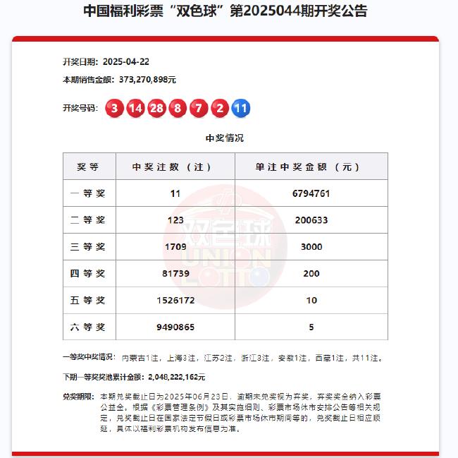 22:12 本期一等奖开出11注,单注奖金679万元,分落上海(3注)、浙江(3注)、江苏(2注)、内蒙古、安徽和西藏6地。二等奖开123注,单注奖金20.06万余元。本期双色球全国销量为3.73亿,计奖结束后奖池余额为20.48亿余元。