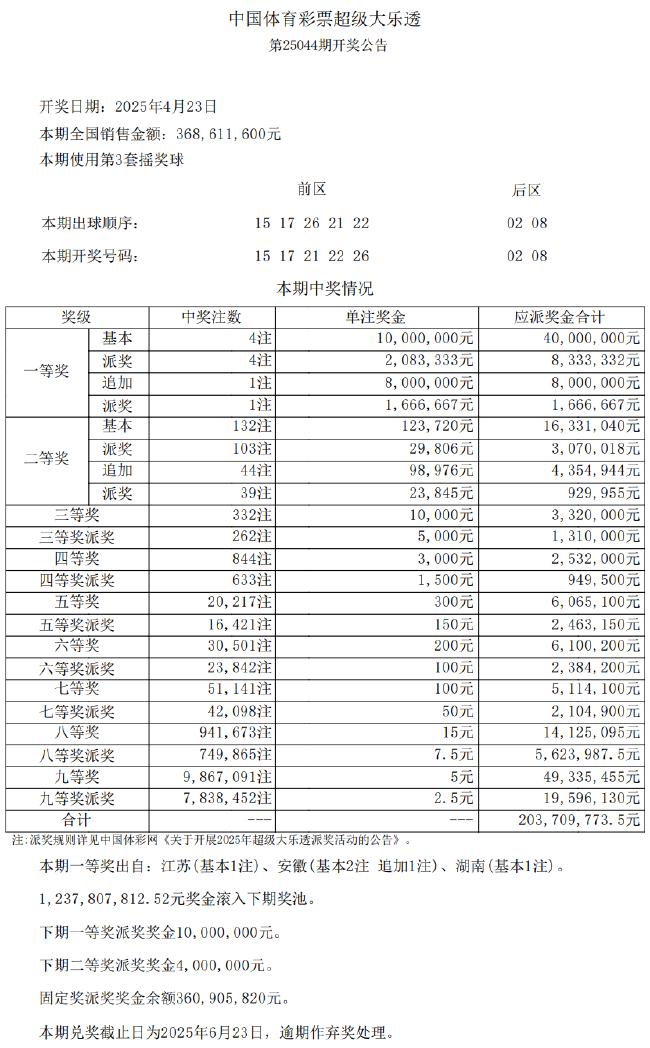 本期全国销量为3.68亿元,奖池方面,本期开奖结束后,12.37亿元滚存至4月26日(周六)开奖的第25045期。
