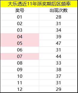 提到大乐透派奖期后区各奖号现身频率,笔者统计了近11年的数据。从表格中可以看出,05码成派奖期间最受欢迎的后区号码。其次就是04码、07码、09码和10码,可见奇数码还是略胜一筹。值得注意的是,后区出现次数排名第三的07码在今年派奖期间还未现身,后期是否会频繁开出呢,让我们拭目以待。