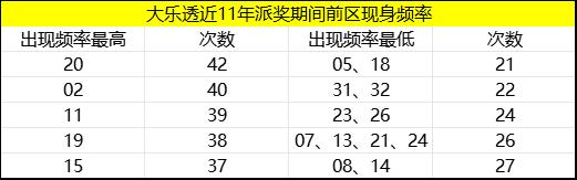 后区方面,后区第一码当中,03和05现身32次,并列频率最高。后区第二码中,09和11分别现身30次,同样并列开出频率最多。通过派奖期间后区两码的现身次数来看,某一个奇码频发现象较多。由此可见,今年派奖期7次开奖,后区11连续现身3次就不奇怪了。