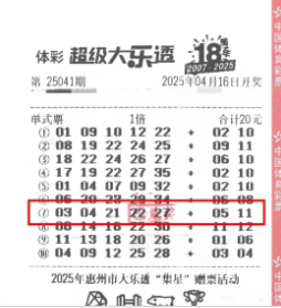 4月16日,超级大乐透第25041期开奖,前区号码为03、04、21、22、27,后区号码为05、11。位于惠州市惠东县稔山镇碧桂园海头埔苑12号楼3单元01号铺的4411032606体彩实体店的购彩者中得了一注大乐透一等奖,奖金达到928万元。4月21日下午,中奖者陈女士(化名)现身惠州市体育彩票中心办理兑奖手续,并为当地贡献税收185.6万元。她表示,直到4月20日晚才得知自己中了大奖。