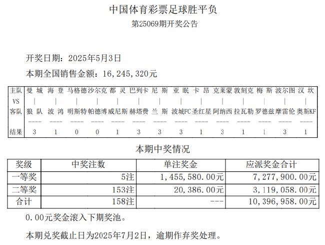 北京时间5月3日,胜负彩第25069期开奖结果揭晓。本期足彩头奖仅开5注,单注奖金1,455,580元;二等奖开出153注20,386元;任九开2236注5171元。本期14场销量为16,245,320元,任九投注总额为18,066,338元。