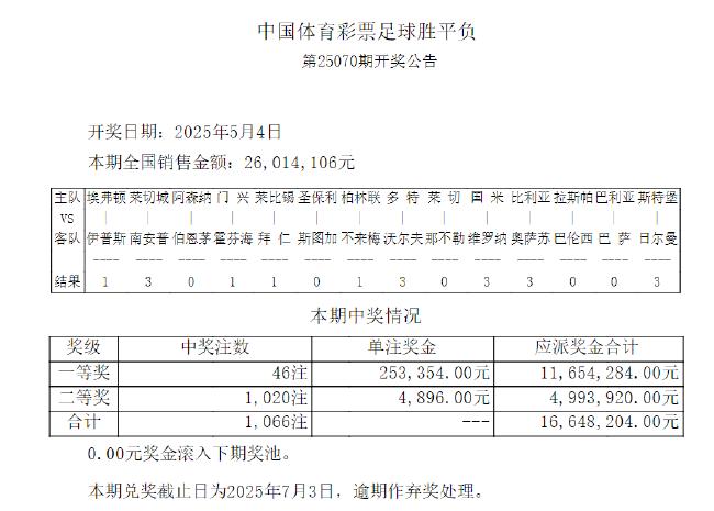 北京时间5月4日,胜负彩第25070期开奖结果揭晓。本期足彩头奖开46注,单注奖金253,354元;二等奖开出1020注4896元;任九开12200注1139元。本期14场销量为26,014,106元,任九投注总额为21,724,364元。