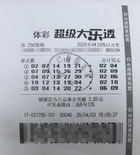 近日,体彩超级大乐透第25036期开奖,前区号码为04、07、13、27、30,后区号码为02、06。来自东莞长安镇新发南路三街的4417031795体彩实体店传来好消息,店内中出1注1000万元(基本)一等奖。4月10日上午,当期大奖得主黄先生(化姓)在家人的陪伴下,来到了东莞市体育彩票管理中心办理兑奖手续。黄先生凭借一张10元的大乐透自选票,成功收获了1000万元(基本)一等奖,并为社会贡献了200万元税收。