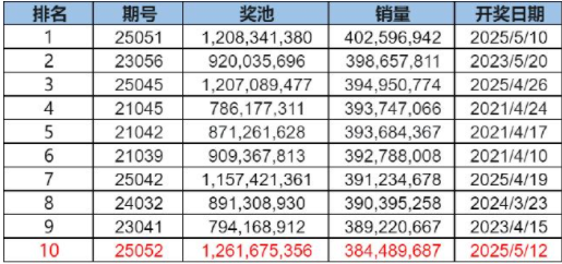 本期全国销量为3.84亿元,奖池方面,本期开奖结束后,12.61亿元滚存至5月14日(周三)开奖的第25053期。