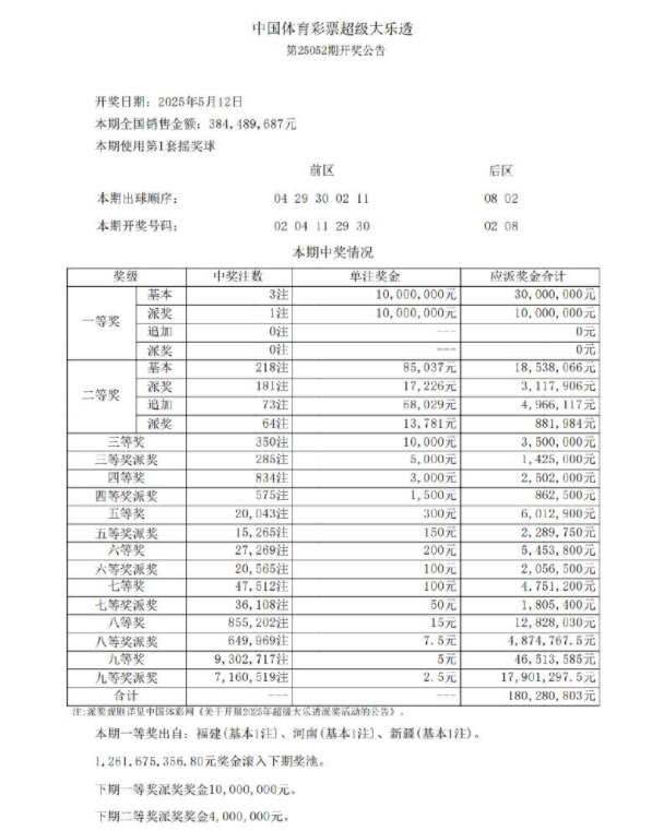 北京时间5月12日晚,体彩超级大乐透第25052期开奖,同时本期也是大乐透8.8亿大派奖活动的第15期,当期开奖号码为:02 04 11 29 30+02 08。值得注意的是,第25052期销量达到3.84亿多元,跻身大乐透历史单期销量TOP10!