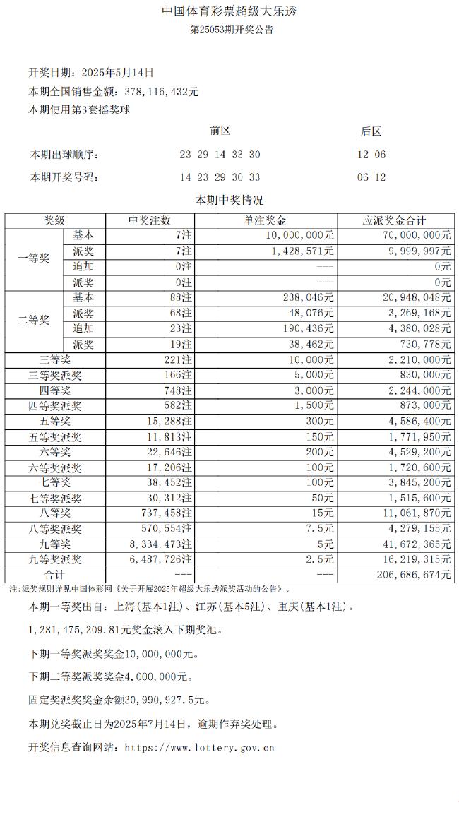北京时间5月14日晚,体彩超级大乐透第25053期开奖,同时本期也是大乐透8.8亿大派奖活动的第16期,当期开奖号码为:14 23 29 30 33+06 12。