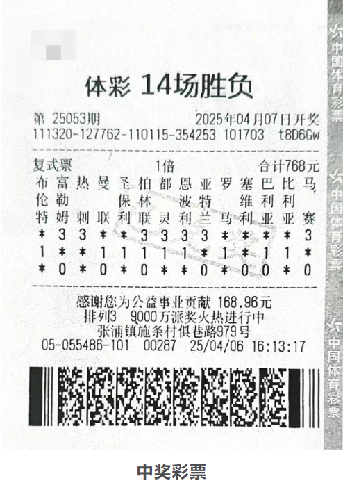 4月7日,传统足彩14场胜负第25053期开奖,当期一等奖全国仅开出3注,单注奖金500万元,江苏省苏州彩友杨先生摘得其中1注,连同其它小奖,他的总奖金达到559万多元。