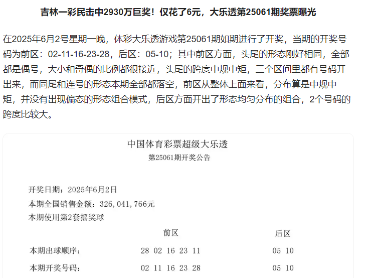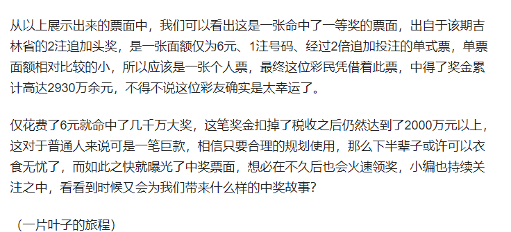 仅花6元 吉林一彩民击中大乐透2930万大奖