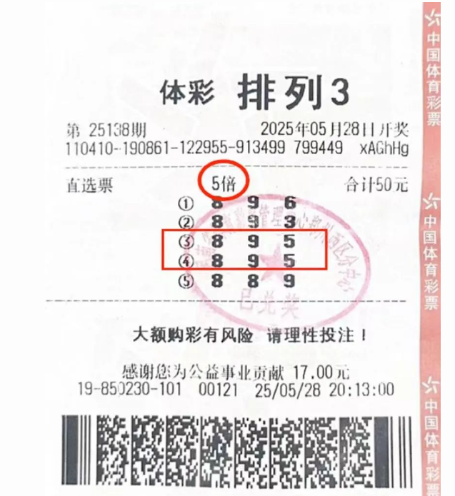 5月28日晚上,龚先生像往常一样来到常去的体彩实体店。经过仔细斟酌,他精心挑选了5注排列3号码,其中第3注是“898”。不料,代销者在出票时不慎将“898”误打为“895”,而巧合的是,这个错误号码与票面第4注完全重合。“当时发现打错后我立即向龚先生说明情况,准备重新出票。”代销者回忆道。