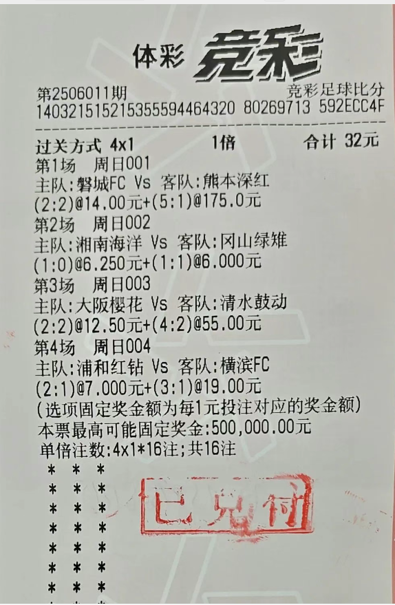 这张中奖彩票出自常州市新北区燕兴社区门口的3204054443体彩站点。据了解,这位中奖者是竞彩足球的忠实粉丝,偶尔也会购买大乐透和即开票,他常常光顾这家体彩站点。中奖票的投注方式为4x1,每场比赛选择了两种比分。此次大奖的关键来自于周日001场磐城FC对阵熊本深红以及周日003场大阪樱花对阵清水鼓动的两场比赛,他成功命中了(5:1)与(4:2)的比分结果。从这些投注选择可以看出,这位购彩者不仅拥有丰富的经验,还对比赛进行了深入的分析,考虑到了球队的实力、战术和球员状态等多个因素。