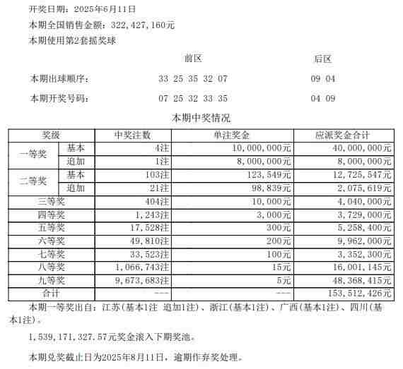北京时间6月11日晚,体彩大乐透第25065期开奖,当期开奖号码为前区07 25 32 33 35,后区04 09。