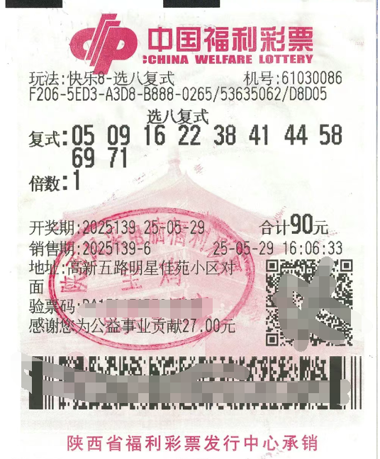 5月29日,快乐8游戏第2025139期开奖,宝鸡市高新区传来好消息,一位资深彩民喜中快乐8选八大奖!据了解,这张中奖彩票是在高新五路明星佳苑小区对面的福彩第61030086号投注站售出的,票为10码选八复式自选票。中奖者成功选中了8个号码,获得“选八中八”一等奖1注、“选八中七”16注、“选八中六”28注,总奖金高达65264元。