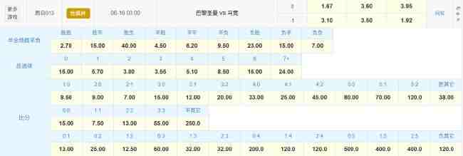 竞彩官方给世俱杯B组焦点战开出了1.67(大巴黎胜) 3.60(平局) 3.95(马竞胜)的赔率组合,大巴黎明显人气占优!与此同时开出了比分赔率,其中大巴黎2-1取胜最低,目前为1赔7,其次是1-1的平局,赔率为1赔7.5;大巴黎1-0和2-0赢球分别为1赔8.5和1赔9紧随其后。马竞方面,赢球的最低赔为2-1的1赔12.5。总体来看,大巴黎数据占据上风,世俱杯死亡之组首秀,大巴黎或凭借华丽的进攻拿下马竞这块硬骨头!
