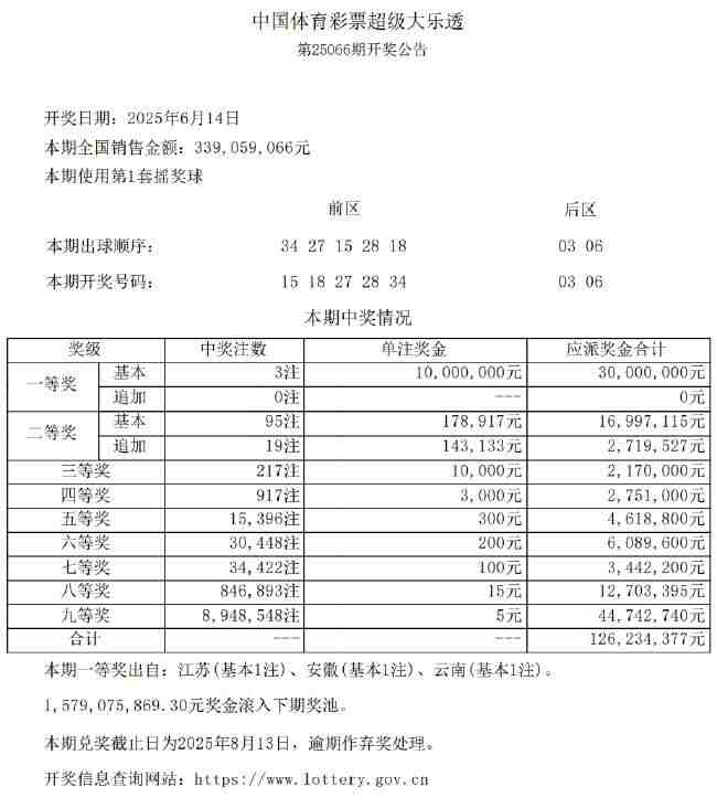 本期全国共开出3注一等奖,单注奖金1000万元,分落江苏、安徽、云南。二等奖开出95注,单注奖金17.8万余元,其中19注采用追加投注,每注多得奖金14.3万余元。本期全国销量为3.39亿元,奖池方面,15.79亿余元滚存至6月16日(周一)开奖的第25067期。