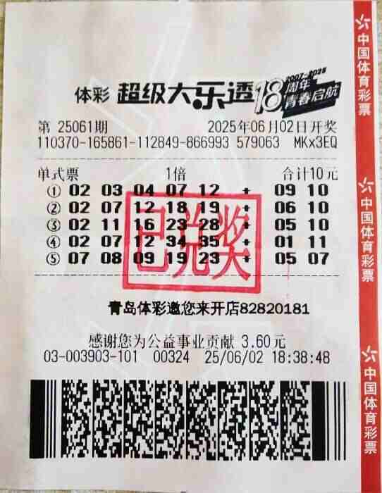 6月2日,超级大乐透第25061期开奖。前区开出号码02、11、16、23、28;后区开出号码05、10。当期全国共中出10注一等奖,山东青岛中得基本投注一等奖1注,奖金813万余元。