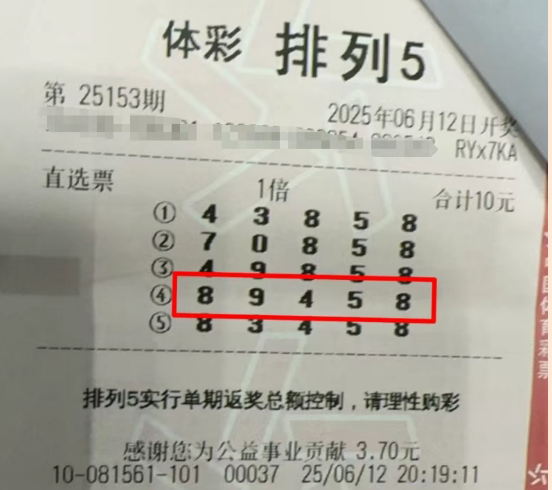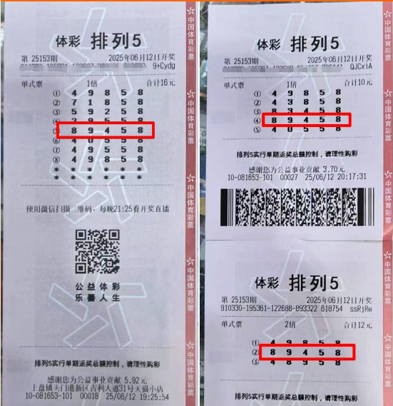 6月12日,体彩“排列5”第25153期开奖结果为8、9、4、5、8。位于台州临海市上盘镇头门港新区吉利大道31号的体彩实体店,幸运地中出了4注一等奖,每注奖金为40万元。根据销售员张先生的了解,中奖者何先生是该店的常客,几乎每天晚上都会购买几注“排列5”。当天晚上,销售员张先生正在清理卫生,快要关店时接到何先生的电话,得知他中了“排列5”一等奖,奖金40万元。第二天,何先生早早请假前往台州市体彩中心兑奖,领取了属于自己的40万元大奖,并表示将继续支持中国体育彩票,支持公益事业。