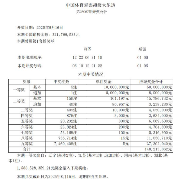 2025年6月16日晚,体彩大乐透第25067期开奖结果为:前区06、10、12、21、22,后区01、06。本期全国共开出5注基本头奖,每注奖金1000万元,其中1注为追加投注,额外获得800万元。江苏省收获1注追加头奖,辽宁(2注)、河南和湖北各获得1注基本头奖。二等奖开出156注,每注奖金超过10.1万元,其中40注为追加投注,额外奖金为8万余元。本期全国销量达到3.21亿元,奖池方面,15.88亿元将滚存至6月18日(周三)开奖的第25068期。