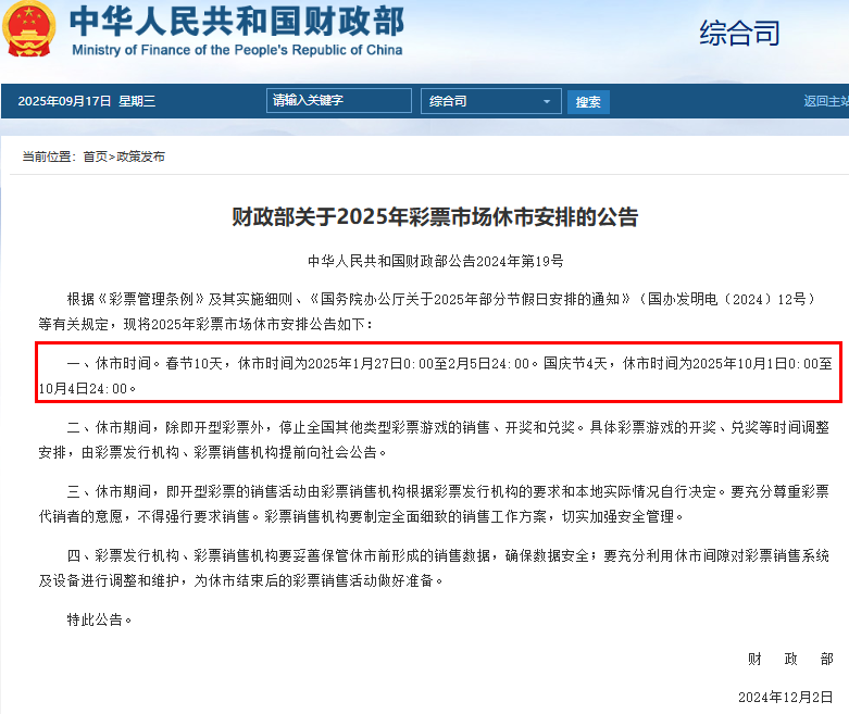 财政部官网发布《关于2025年彩票市场休市安排的公告》(以下简称“公告”)。依据公告,2025年彩票市场休市安排为,国庆节4天,休市时间为2025年10月1日0:00至10月 4日24:00。休市期间,除即开型彩票外,停止全国其他类型彩票游戏的销售、开奖和兑奖。