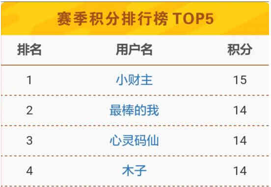 “特区头尾王”擂台赛加时赛,“小财主”技高一筹,拿下5888元冠军奖,并获得“特区头尾王”的称号。“木子”、“最棒的我”和“心灵码仙”并列亚军,分别获取价值588元旺财手链一条。另,“那飞公子东”、“今晚不中奖”7连中,分别获得688元奖金;“魅力一号”5连中,获得价值588元旺财手链一条。