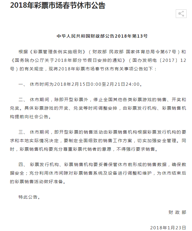 温馨提示:2018年春节彩市休市时间:2月15日0:00-2月21日24:00。七星彩,2月13日年前最后一期开奖,2月23日年后第一期开奖;大乐透,2月14日年前最后一期开奖,2月24日年后第一期开奖;排列三五,2月14日年前最后一期开奖,2月22日年后第一期开奖。