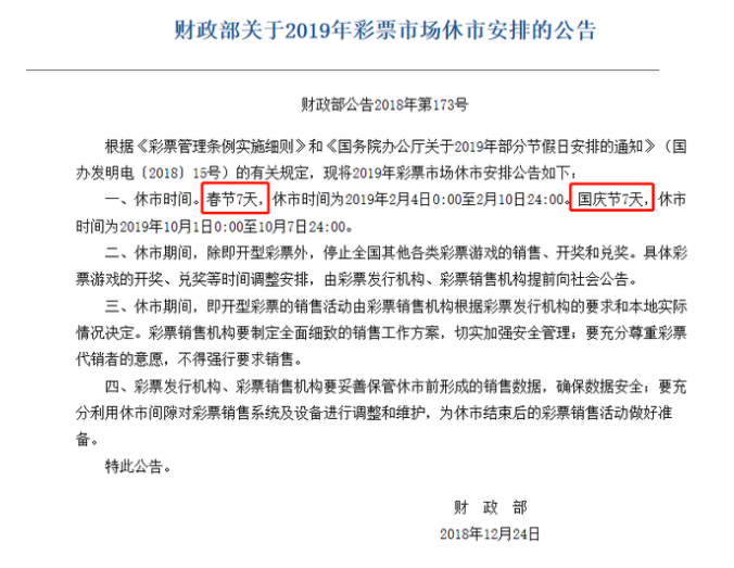 2019年春节彩票市场休市安排公告如下:
