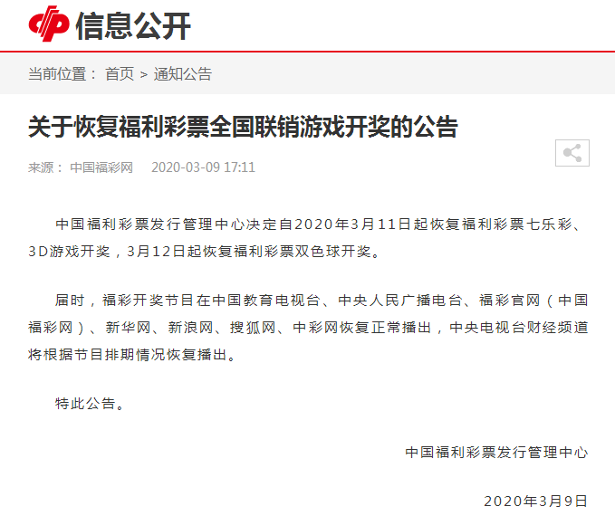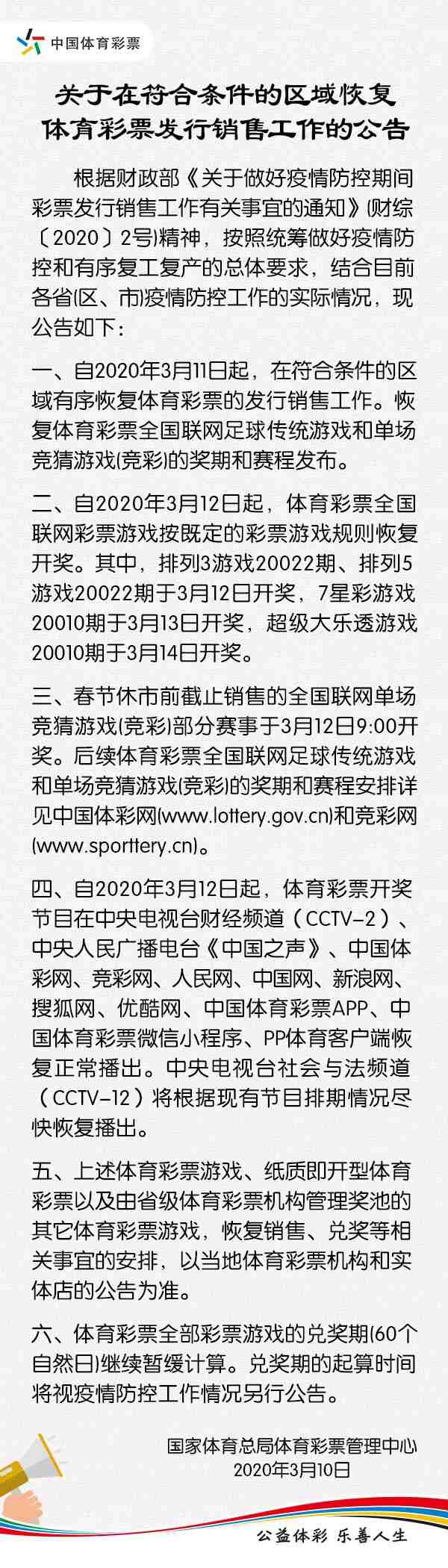 体彩官宣:排列五3月12日开奖,七星彩3月13日开奖,大乐透3月14日开奖。 福彩官宣:自2020年3月11日起恢复福利彩票七乐彩、3D游戏开奖,3月12日起恢复福利彩票双色球开奖。