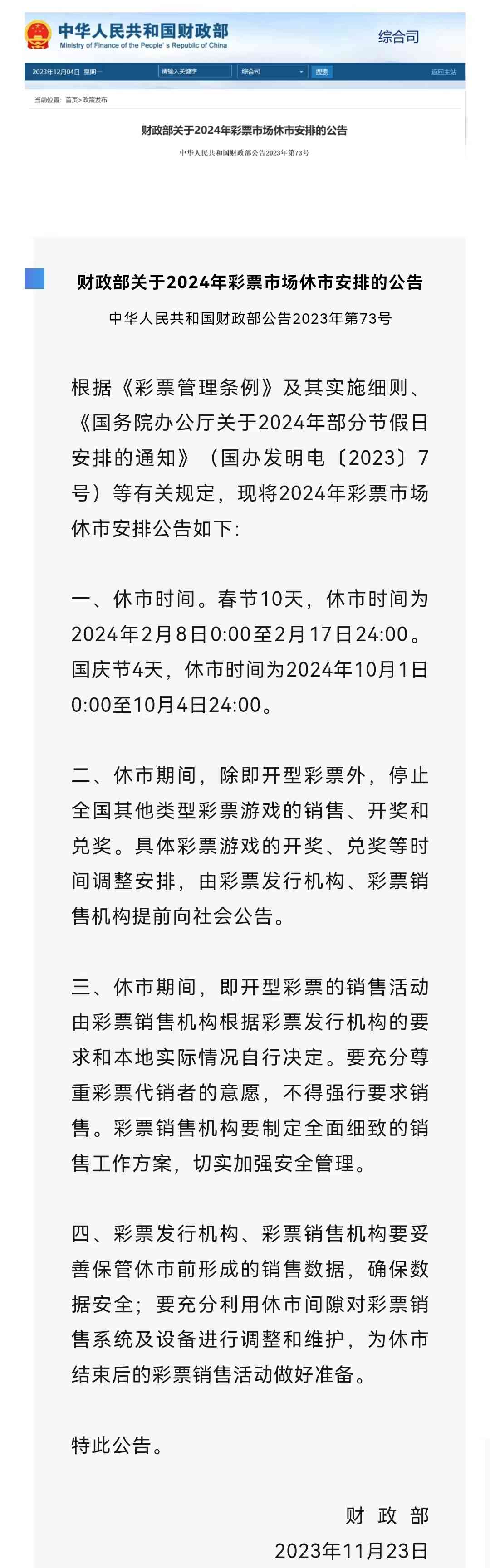 12月1日财政部官网发布《关于2024年彩票市场休市安排的公告》(以下简称“公告”)。依据公告,2024年彩票市场休市安排为,春节10天,休市时间为2024年2月8日0:00至2月17日24:00。国庆节4天,休市时间为2024年10月1日0:00至10月4日24:00。休市期间,除即开型彩票外,停止全国其他类型彩票游戏的销售、开奖和兑奖。