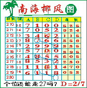 “南海椰风”第1280期推荐版局规律,本期个位27走三步.