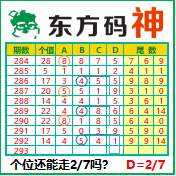 “东方码神”第3293期推荐此隔板规律,本期个位站“27”走第三步.