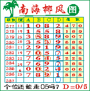 “南海椰风”第1387期推荐版局规律,本期个位05走三步.
